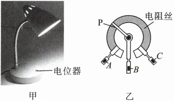5. 如图甲所示的调光型台灯,通过旋动下方连接碳膜电阻的旋钮,调节灯的亮度。调节亮度的电位器如图乙所示,它相当于一个