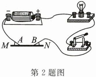 2. 如图所示,小明同学设计的模拟调光台灯电路,用A、B两个金属夹子夹住一段粗细均匀的铅笔芯MN,当闭合开关后,小灯泡亮,说明铅笔芯是