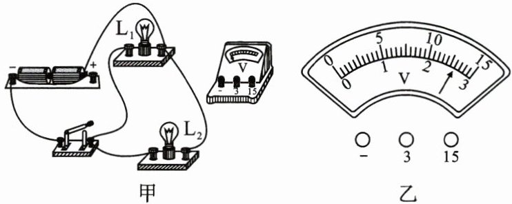 (2)电路连接正确后进行实验,某小组分别测出灯 $ L_1 $、$ L_2 $ 两端的电压和并联电路的总电压,电压表示数相同,如图乙所示,其值为______ $ V $。根据这组数据,该小组得出并联电路中电压的规律。你认为实验的疏漏之处是______。