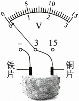 3. (淄博市中考)如图所示,把铜片、铁片插入菠萝中,制成一个水果电池。用电压表测量它的电压,则(