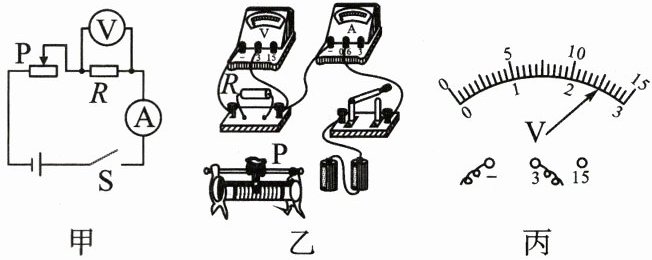 (4) 闭合开关,将图乙中的滑动变阻器的滑片P滑到某一位置时,电流表的示数为0.5A,电压表的示数如图丙。由此可知被测电阻的阻值R= ____Ω。