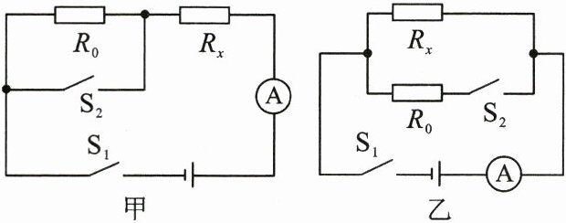 。(2)断路法:电路如图乙所示:先闭合开关 $ S_1 $,测出通过 $ R_x $ 的电流 $ I_1 $;然后再闭合开关 $ S_2 $,测出通过 $ R_x $ 和 $ R_0 $ 的总电流 $ I $,因 $ I_1 R_x = (I - I_1) R_0 $,则 $ R_x = $