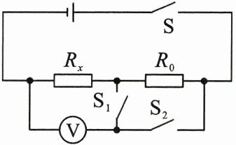 4. (娄底市中考改编)在测量未知电阻的阻值的实验中,实验室缺少电流表,老师给了小强一个已知阻值为 $ R_0 $ 的定值电阻和若干开关,小强设计的电路如图所示,实验步骤如下: