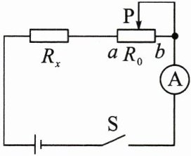 器材:电流表一只、阻值已知的定值电阻 $ R_0 $ 一个、待测电阻 $ R_x $、开关、电源和导线。