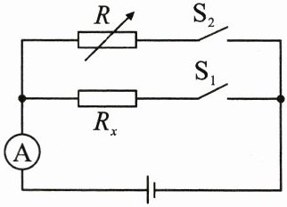 5. 小聪同学用伏安法测电阻的过程中,电流表突然烧坏,不能正常使用了。他想出一个方法,运用现有的器材,也可测出电阻 $ R_x $ 的阻值,实验电路图如图所示(滑动变阻器的最大阻值为 $ R $)。请完成下列实验步骤。