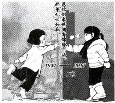 示例:漫画上有两个小女孩,左边的女孩衣衫褴褛,在战火纷飞的街头踉跄地向前跑着;右边的女孩穿着整齐,正在前方等着迎接她。画面上的数字"1937-2017"表明她们中间相隔80年。两个女孩时隔80年隔空对话,蕴含了和平不易,应当牢记历史,珍惜现在的美好生活的寓意