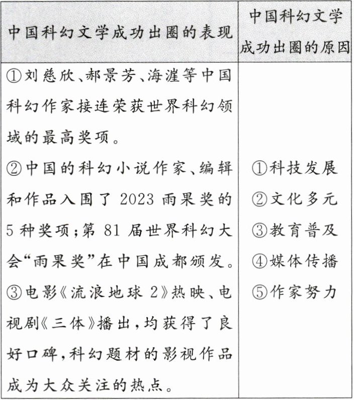 (2) 为了了解中国科幻文学成功出圈的表现及原因,小语在网上查阅相关资料,梳理了以下内容。请整合其内容,补全下面的资料卡。注意表达简明、连贯、通顺。