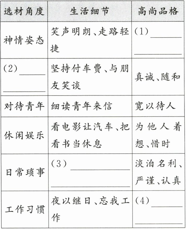(1)乐观开朗 (2)对待朋友 (3)手稿做他用、吃鱼丸、包书 (4)无私奉献