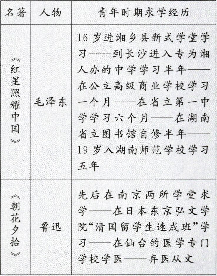 8.小鲁读了名著《红星照耀中国》《朝花夕拾》后,梳理了毛泽东主席和鲁迅先生青年时期的求学经历。请参考下面表格中的资料,联系名著,从求学经历、人生理想两方面分析毛泽东主席和鲁迅先生青年时期的共同点。