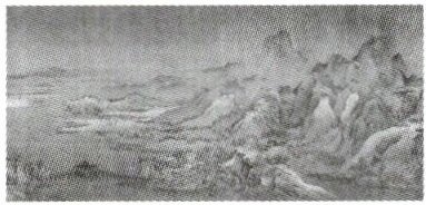⑤王希孟用七大组群山构图,每组都将主峰和诸多辅峰组合起来,宛若一座座仙岛矗立于江畔。七组群山泾渭分明,正如北宋宫廷山水画家郭熙所言,“主峰已定,方作以次近者、远者、小者、大者。以其一境主之于此,故曰主峰,以君臣上下也”,恰似高潮迭起、亢奋优雅的协奏曲,节奏感十分鲜明。