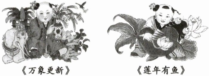 3. 【传统文化】民间传统年画中,天津“杨柳青”颇具盛名。小语在搜集资料时发现年画《万象更新》《莲年有鱼》都很有趣,他写了下面两段文字,请帮他完成。