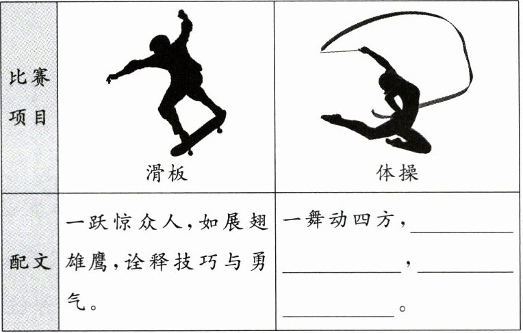 4. 跨学科体育请仿照所给文字,为“精彩瞬间”栏目的剪影图片配上解说文字。