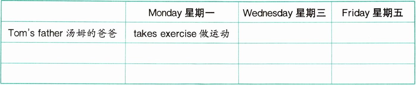 3~4 人一组。一名组员首先调查组内其他成员的家庭成员在星期六/星期日做什么,然后运用“What does+主语(第三人称单数)+often do on Saturday/Sun-day?”向组内其他成员进行询问,并记录下来。最后向全体成员汇报结果。