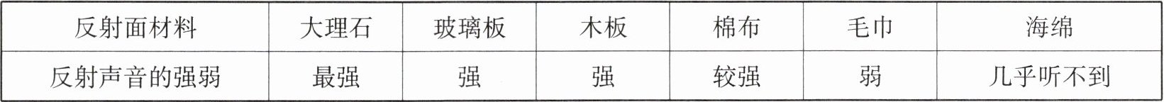 ,只改变充当反射面的材料,让同一名同学倾听反射声音的强弱,实验结果如下表。|反射面材料|大理石|玻璃板|木板|棉布|毛巾|海绵|