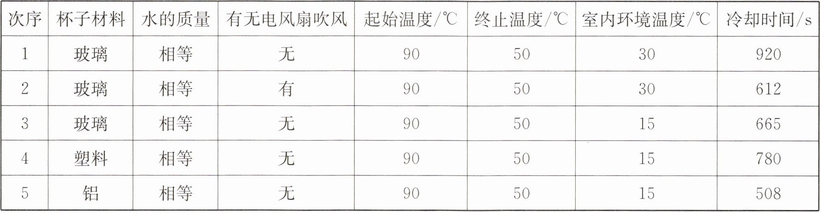 |次序|杯子材料|水的质量|有无电风扇吹风|起始温度/℃|终止温度/℃|室内环境温度/℃|冷却时间/s|