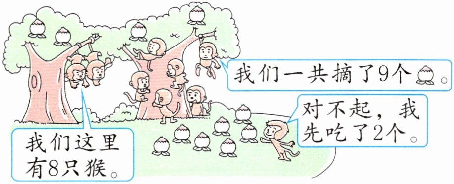 一共有几只猴? 8+1=9(只) 还剩下几个? 9-2=7(个)