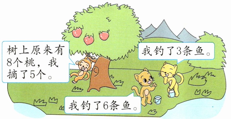 1.3+6=9 2.树上还剩下几个桃? 8-5=3(个)