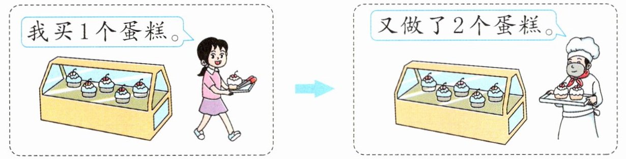 原来有6个蛋糕,小女孩买走了1个,厨师又做了2个,现在一共有7个蛋糕