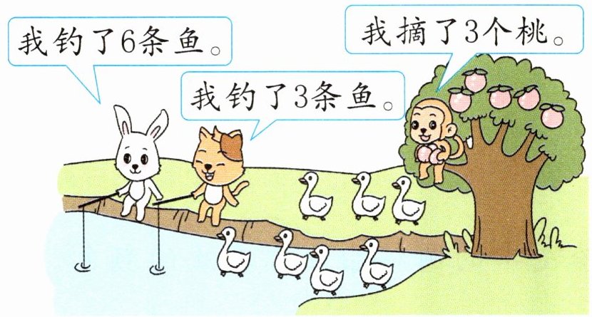 一共钓了多少条鱼? 6+3=9(条) (答案不唯一)