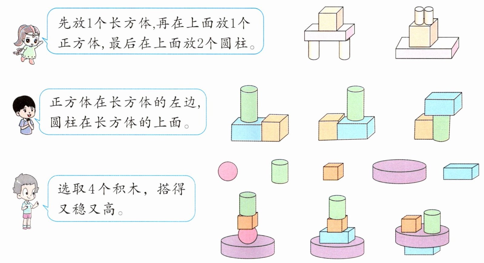 一、在搭得最稳的图形下面画正方形(□),搭得最高的图形下面画圆“○”。