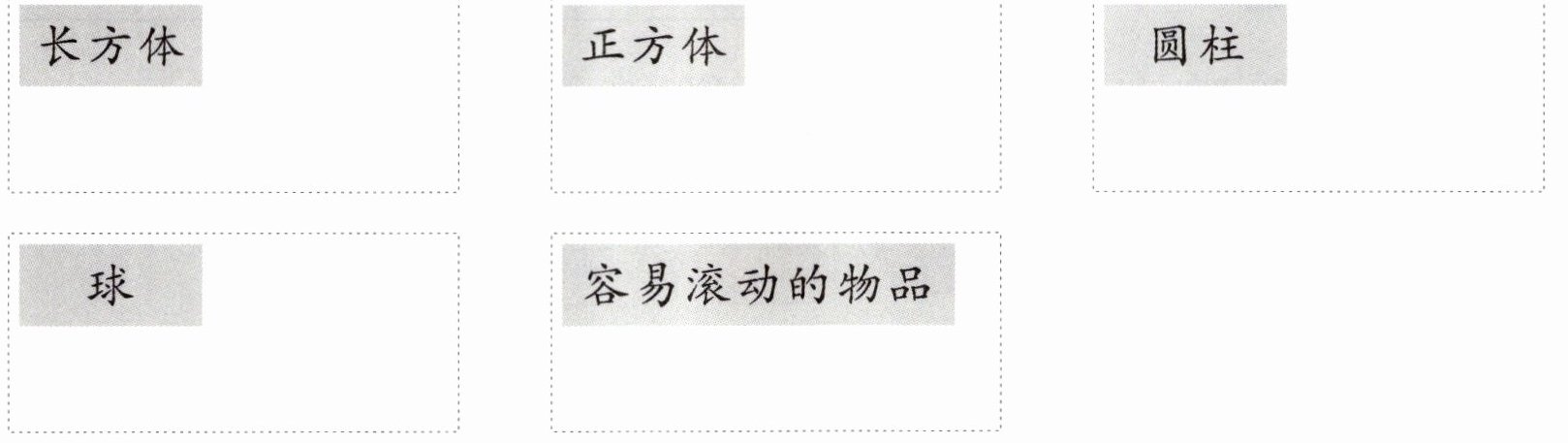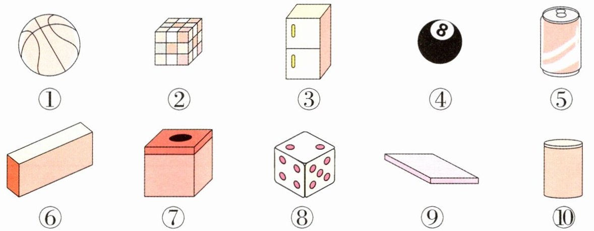 长方体:③⑥⑨ 正方体:②⑦⑧ 圆柱:⑤⑩ 球:①④ 容易滚动的物品:①④⑤⑩