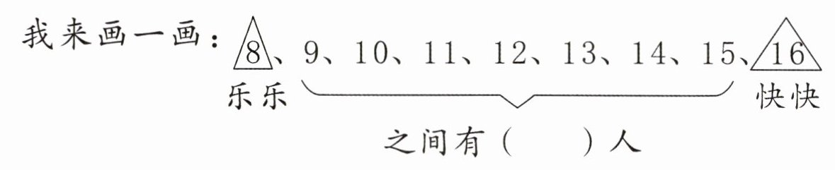 )个同学。我来画一画:$\underbrace{\overset{\triangle }{8}、9、10、11、12、13、14、15、\overset{\triangle }{16}}_{\begin{array}{l}乐乐 \hspace{128pt} 快快\\ \hspace{110pt}之间有(