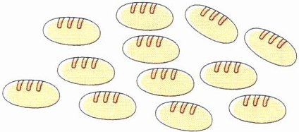 三、面包房的师傅要把12个面包平均装在几个袋子里,可以怎样装?