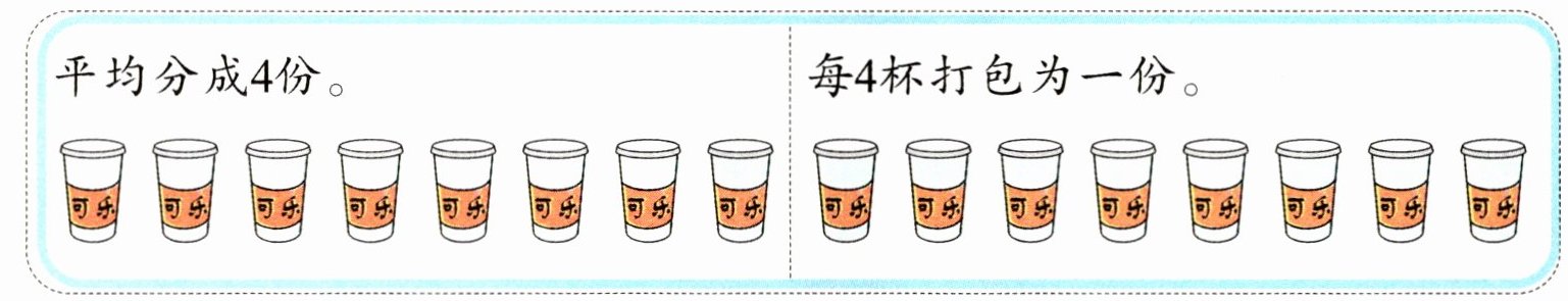 二、请你帮助外卖员李叔叔把 8 杯可乐按要求分一分,圈一圈。
