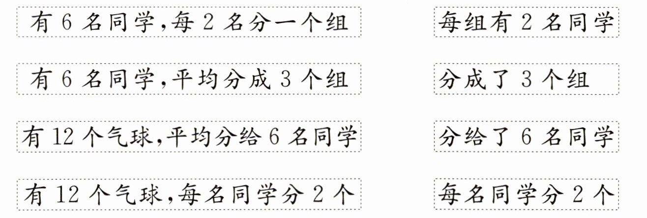 “有$6$名同学,平均分成$3$个组”与“每组有$2$名同学”相连;