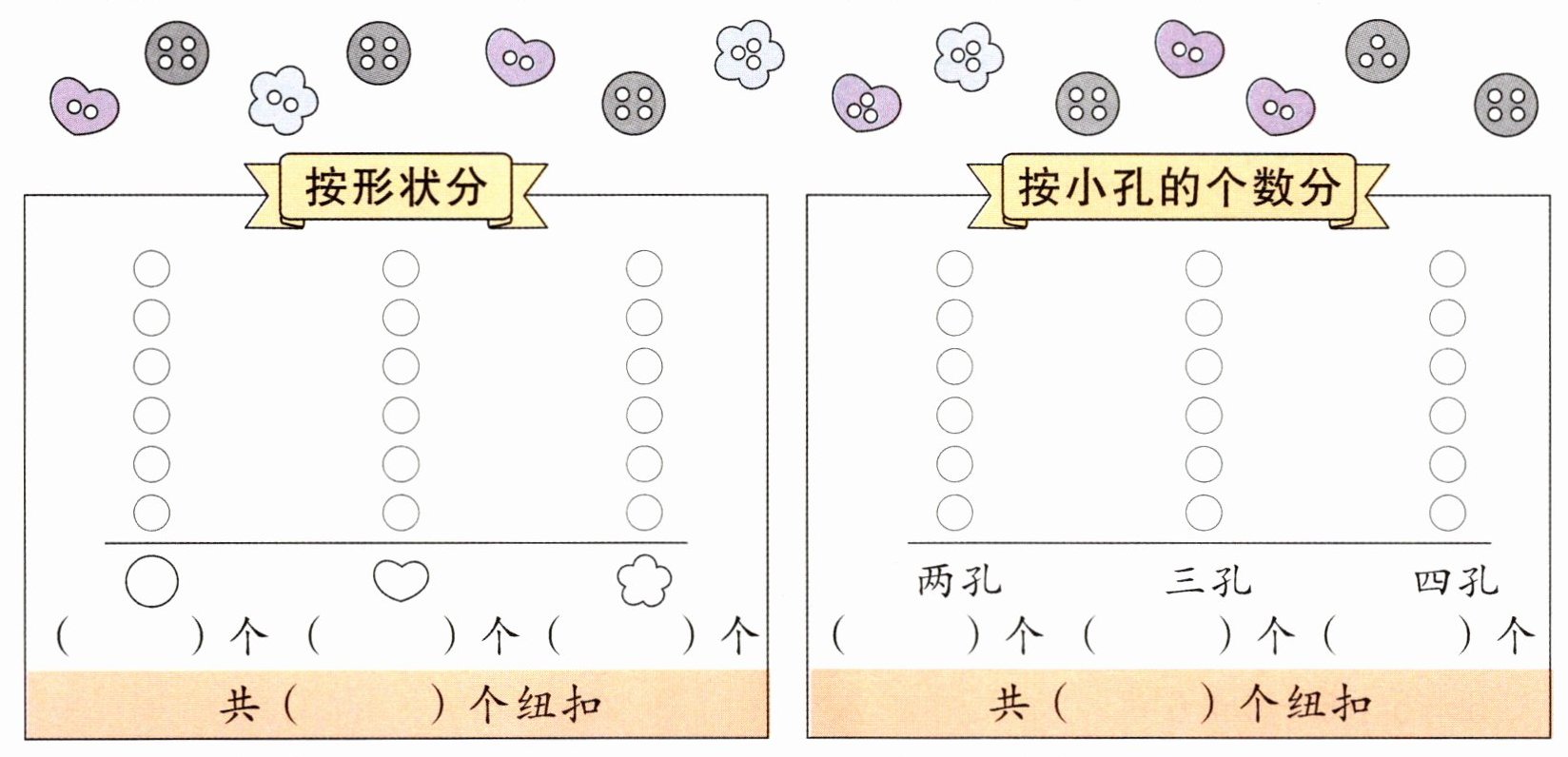 二、妈妈收集了一些纽扣,请你帮忙分一分,涂一涂,填一填。