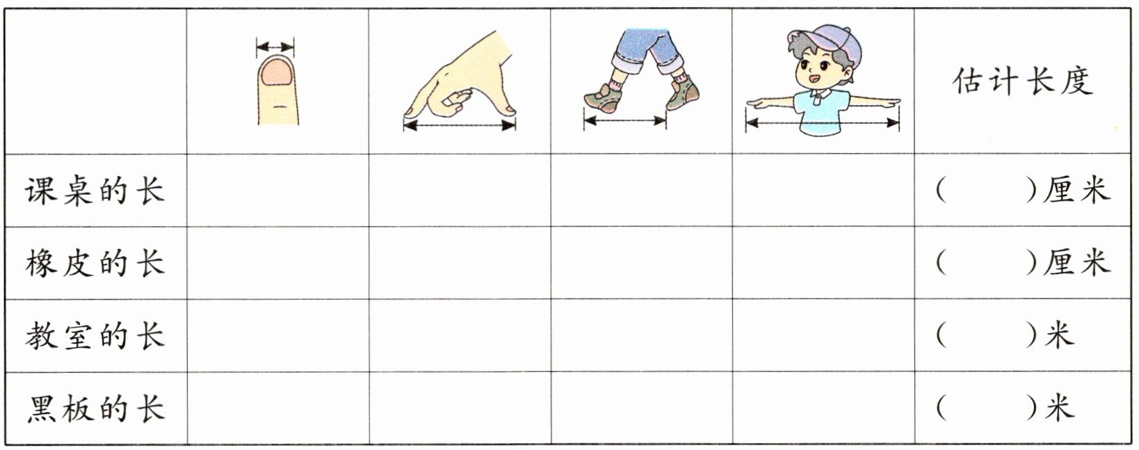 橡皮的长:用“食指宽度”量更合适(在食指宽度对应的格子画√),估计长度$5$厘米;