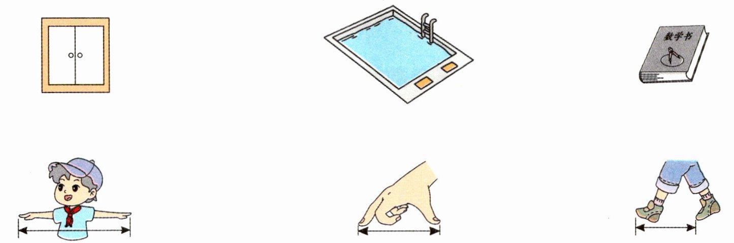 窗的宽度连小男孩两臂伸开,游泳池的长度连脚,数学课本的长度连手指一拃。