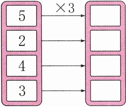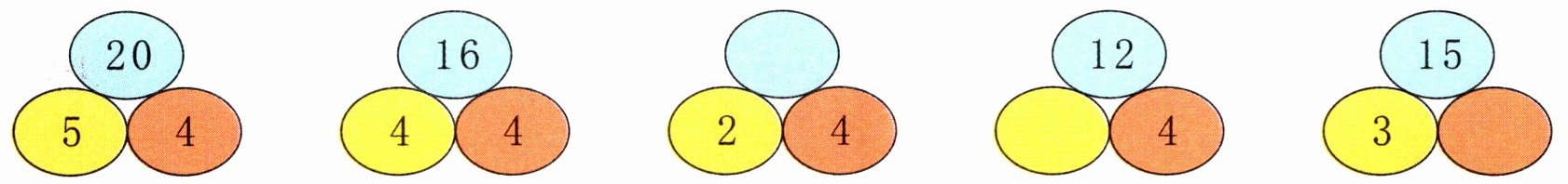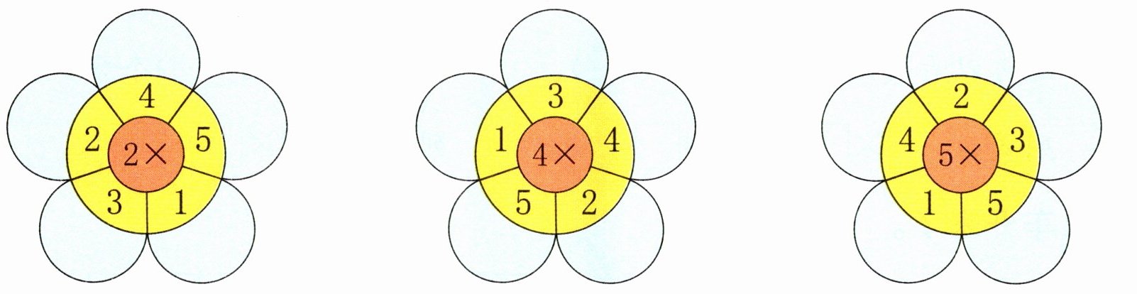 第一朵花(中心:2×)答案:2,4,6,8,10;第二朵花(中心:4×)答案:4,8,12,16,20;第三朵花(中心:5×)答案:5,10,15,20,25