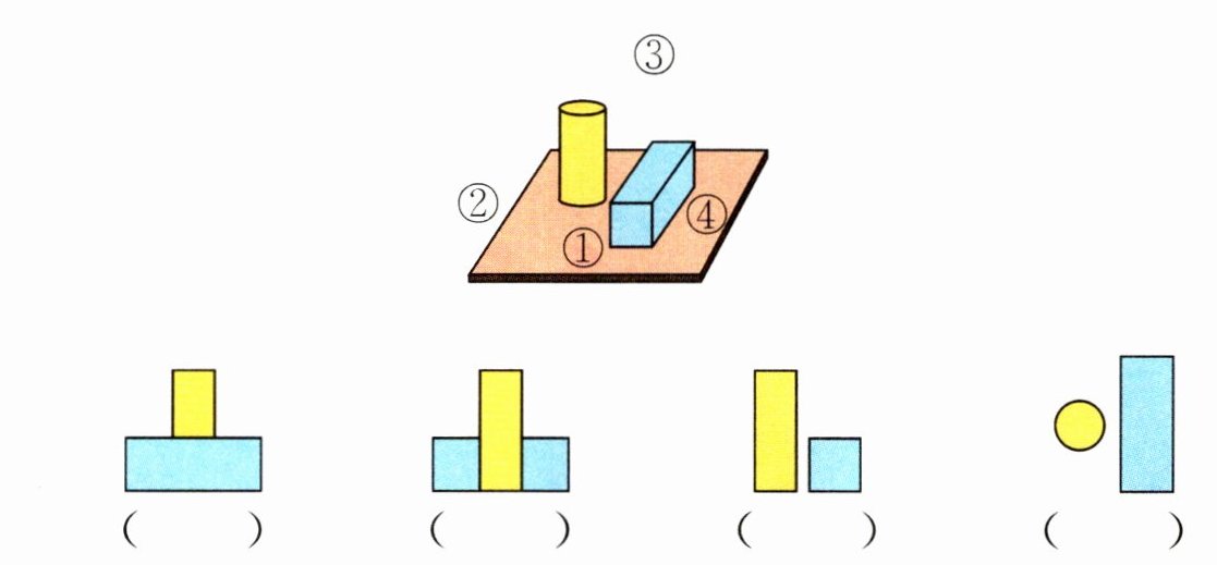 四、下图有一个圆柱和一个长方体,说一说下面四幅图分别是在哪个位置看到的?(填序号)