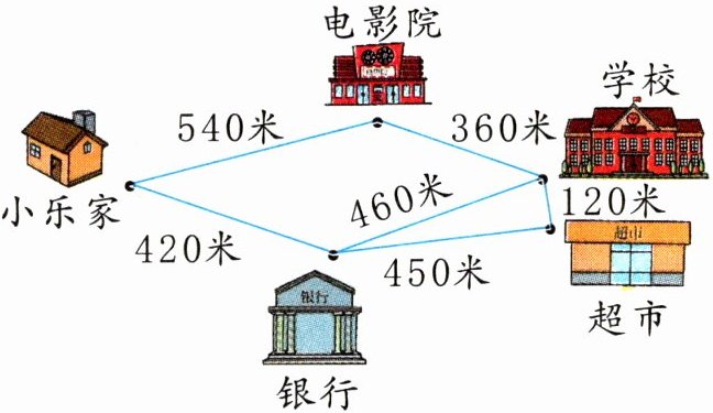 小乐家到学校有三条路可走。 540+360=900(米) 420+460=880(米) 420+450+120=990(米) 880<900<990 答:最近路线为:小乐家→银行→学校,要走 880 米。