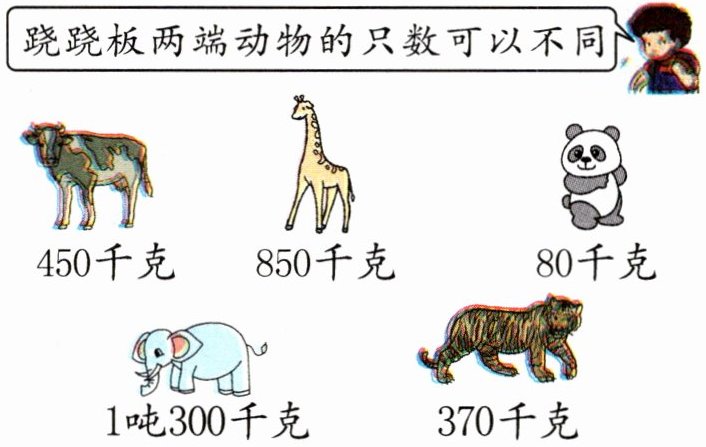 2.1 吨 300 千克=1300 千克 450+850=1300(千克) 答:牛和长颈鹿在一端,另一端为大象,可以使跷跷板平衡。(答案不唯一)
