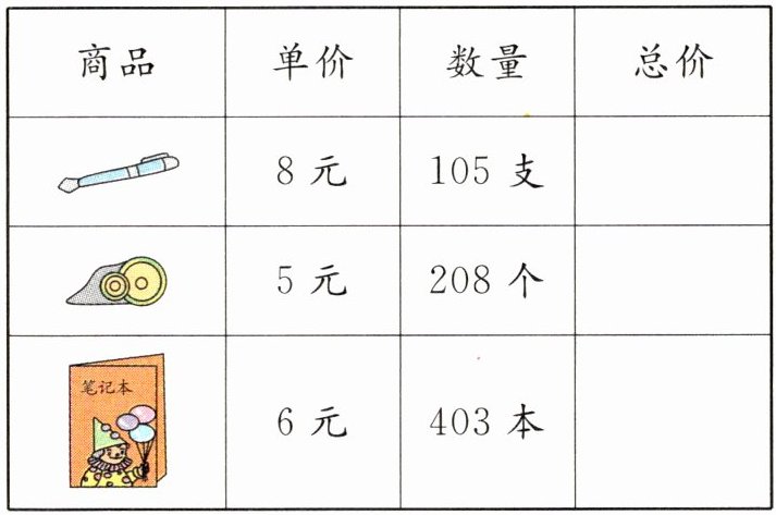 下面是一家文具店的进货单,请你算出每种商品的总价。