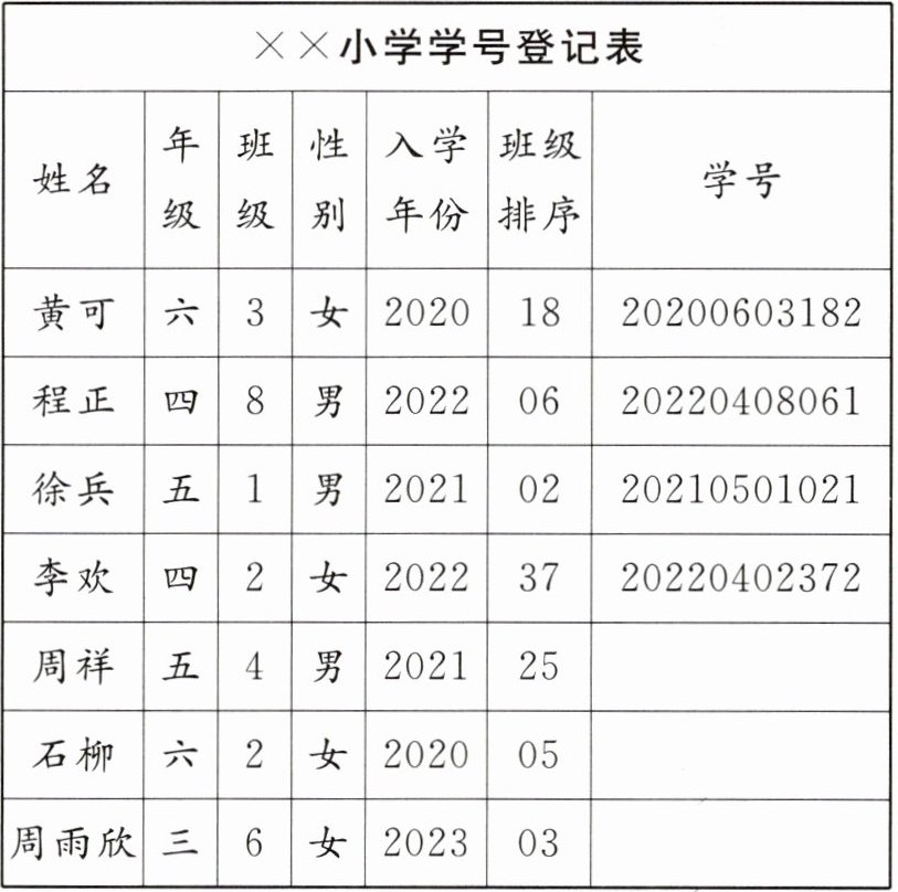 三、下面是某小学部分学生学号登记表,请你找一找学号的编排有什么规律,然后根据你找出的规律给没有学号的学生编上学号。