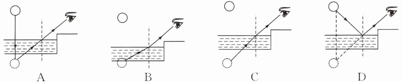 7. 小科在夜游公园时看见月亮在湖中的倒影。下图能正确反映他看到水中“月亮”的光路图的是 (