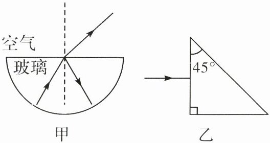 (4)一块三棱镜由图甲中的玻璃制成,让一束光垂直于该三棱镜的一个面射入(如图乙所示),请在图乙中完成这束光的光路图。