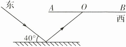 24. 太阳光以接近于其在真空中的传播速度m/s射到地球。当太阳光与地面的夹角为40°时,射到一块平面镜上(如图所示),则入射光线与反射光线的夹角为,反射光线正好经过点O,随着时间的推移,反射光线将向(填“A”或“B”)侧移动。