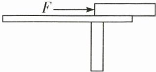 9.如图所示,一均匀的长方体木块放在水平桌面上,现用水平推力 $F$ 把木块推向桌边,在木块掉下去之前,木块对水平桌面的摩擦力大小和压强将 ()