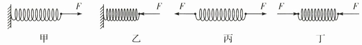 14.在做探究弹簧长度与力的的关系的实验时,小科选取甲、乙、丙、丁四根完全相同的弹簧,将甲、乙弹簧左端分别固定在墙上,用大小为 $F$ 的力拉弹簧甲的右端,用大小为 $F$ 的力压弹簧乙的右端,在弹簧丙的左、右两端施加大小为 $F$ 的拉力,在弹簧丁的左、右两端施加大小为 $F$ 的压力,四根弹簧都水平静止,如图所示。此时四根弹簧的长度分别是 $L_甲$、$L_乙$、$L_丙$、$L_丁$,则 ()