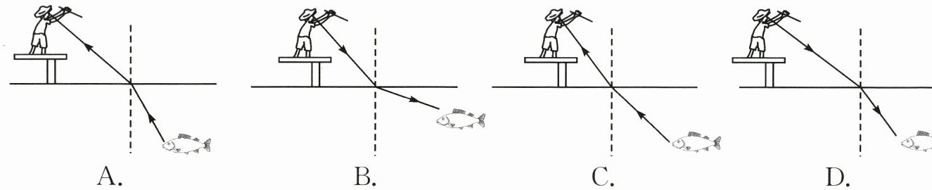 8. 有经验的渔民使用钢叉捕鱼时,要对准看到的“鱼”的下方叉,因为实际的鱼在看到的“鱼”的下方。能正确反映渔民看到“鱼”的光路图的是 ()