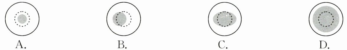 7. 手电筒发出的光竖直向下照射到一个空烧杯底部,在空烧杯底部形成一个圆形光斑(如图中虚线所示)。若向空烧杯中注水到一定高度,烧杯底部的圆形光斑会变为 ()