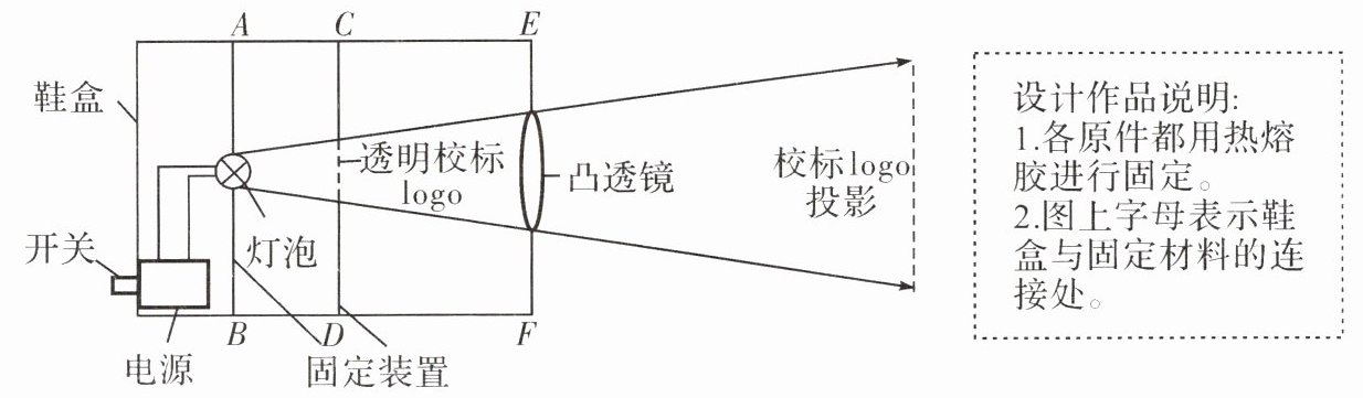 【实验材料】开关、电池、电池盒、电线若干、小灯泡、透明校标logo、凸透镜(焦距$f = 10$ cm)、固定材料、热熔胶(用于黏合)、鞋盒、剪刀等。(每一组材料都相同)