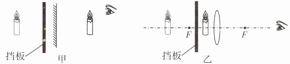 8. 小宁在做“探究平面镜成像和凸透镜成像”两个实验时,分别把一个不透明且不光滑的挡板放置于如图甲、乙所示的位置。下列关于小宁从图中眼睛的视角是否能看到像的说法,正确的是