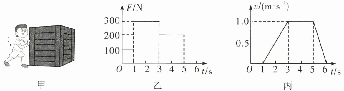 31.如图甲所示,水平地面上有一个质量为 100kg,长、宽、高分别为 50cm、40cm、40cm 的长方体木箱。小金用水平推力 $F$ 将木箱向前推,此过程中,水平推力 $F$ 和木箱前进的速度 $v$ 的大小随时间 $t$ 的变化分别如图乙、丙所示。($g$ 取 10N/kg)