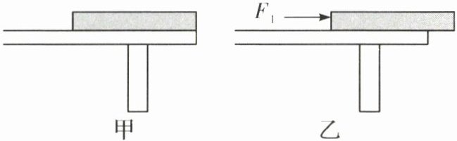 14.如图甲所示,将一块长木板放在水平桌面上。现用水平力 $F_1$ 向右边慢慢推动长木板,使其一部分露出桌面,如图乙所示。推动长木板的过程中,长木板对桌面的压力 $F$、压强 $p$ 和摩擦力 $f$ 的变化情况是