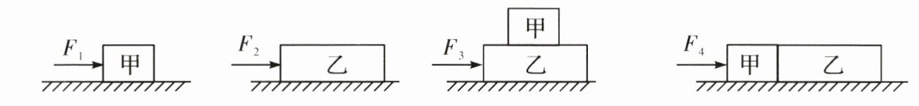 10.如图所示,在同一水平面上,有表面粗糙程度相同、质量不同($m_甲<m_乙$)的甲、乙两木块,按照四种方式放置,分别在水平推力 $F_1$、$F_2$、$F_3$ 和 $F_4$ 的作用下做匀速直线运动,则下列关系式正确的是
